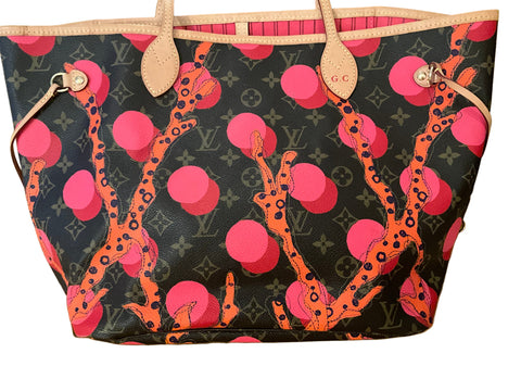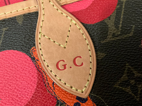 LOUIS VUITTON Monogram Ramages Neverfull MM. This stylish tote is crafted of classic Louis Vuitton monogram on toile canvas in the medium size with a festive and brightly colored orange, blue, pink, and red oceanic coral decorative motif overlay.Personalised with “GC” letters.  This shoulder bag features vachetta cowhide leather top shoulder strap handles, trim and side cinch cords and polished brass hardware. The wide top opens to a pink striped fabric interior with a zippered pocket.