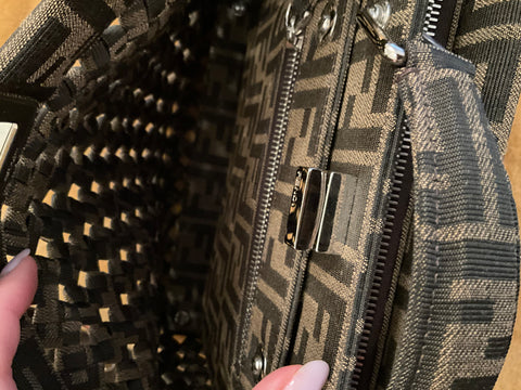 FENDI Fabric Jacquard FF 1974 Woven Knotted Medium Peekaboo Iconic Satchel in Tobacco and Moro. This stylish tote is crafted of brown woven FF fabric. This bag features a top handle, an optional shoulder strap, and a structured frame across the top secured by a turn lock on both sides. This opens to a matching interior with a zipper pocket.
