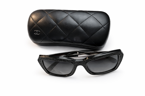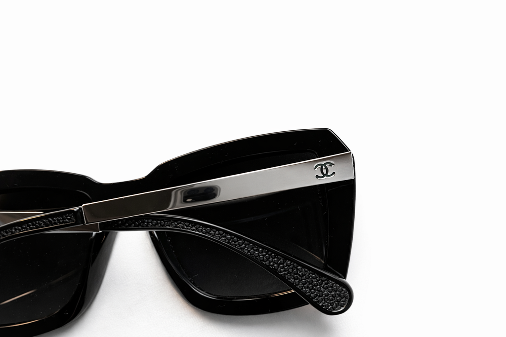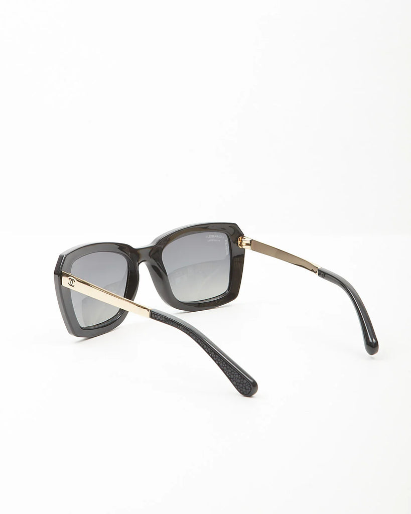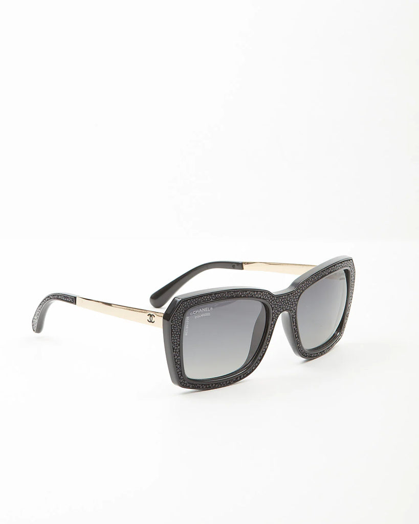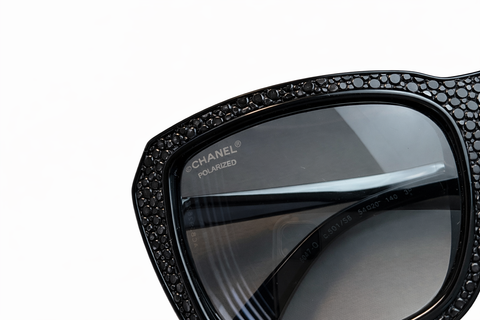CHANEL Stingray CC Polarized Sunglasses 6047-Q in Black. These ultra-chic sunglasses have a cutting edge black frame with squared rims with an inlay of black stingray. The glasses feature gradient polarized lenses in a grey tint, silver arms with Chanel CC logo at the temples and black stingray ear pieces. These are marvelous everyday sunglasses, from Chanel!