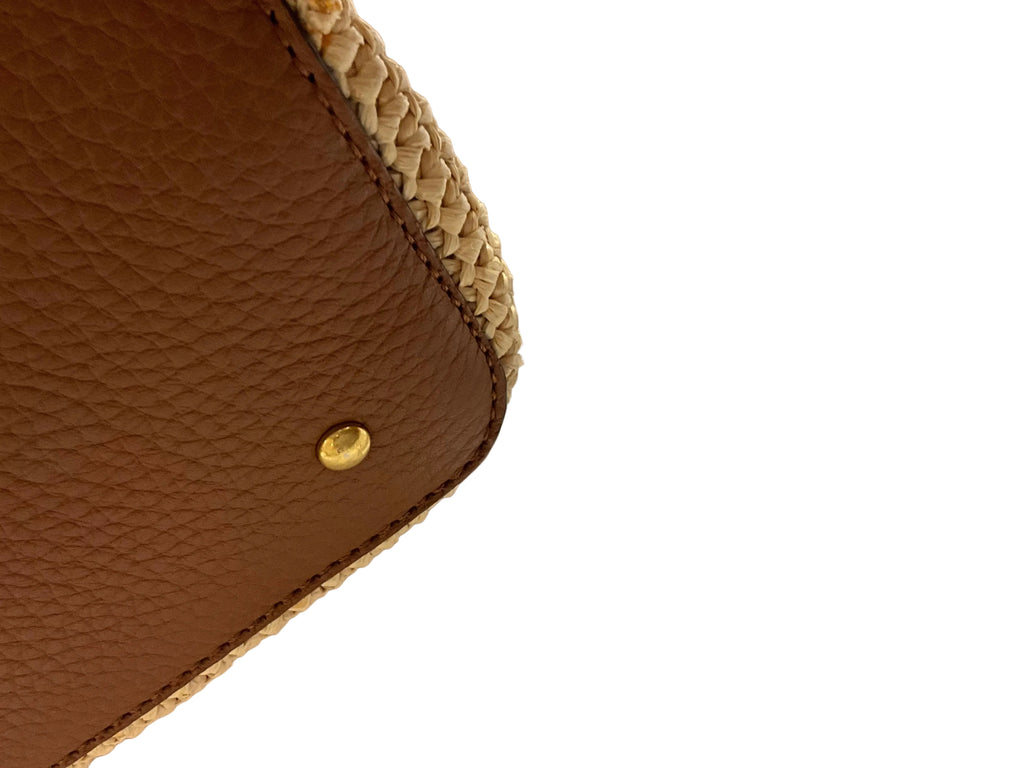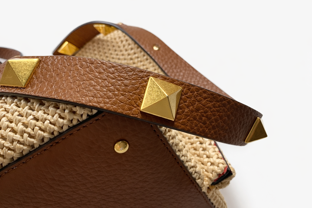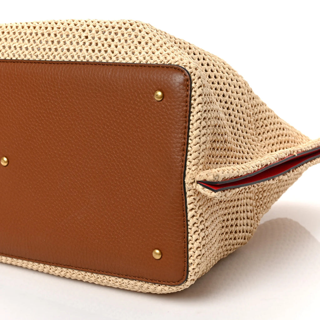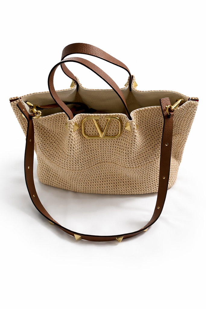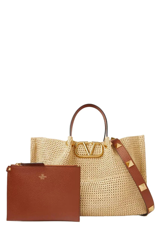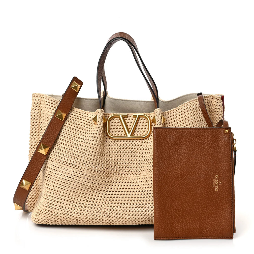 VALENTINO GARAVANI Raffia Grained Calfskin Medium Rockstud Vlogo Tote in Naturale. This versatile tote is crafted of woven raffia with brown leather top handles and a brown leather shoulder strap with gold pyramid studs. The bag features a prominent gold V logo detail on the front. The top is open to a beige fabric interior with a removable brown leather pouch.