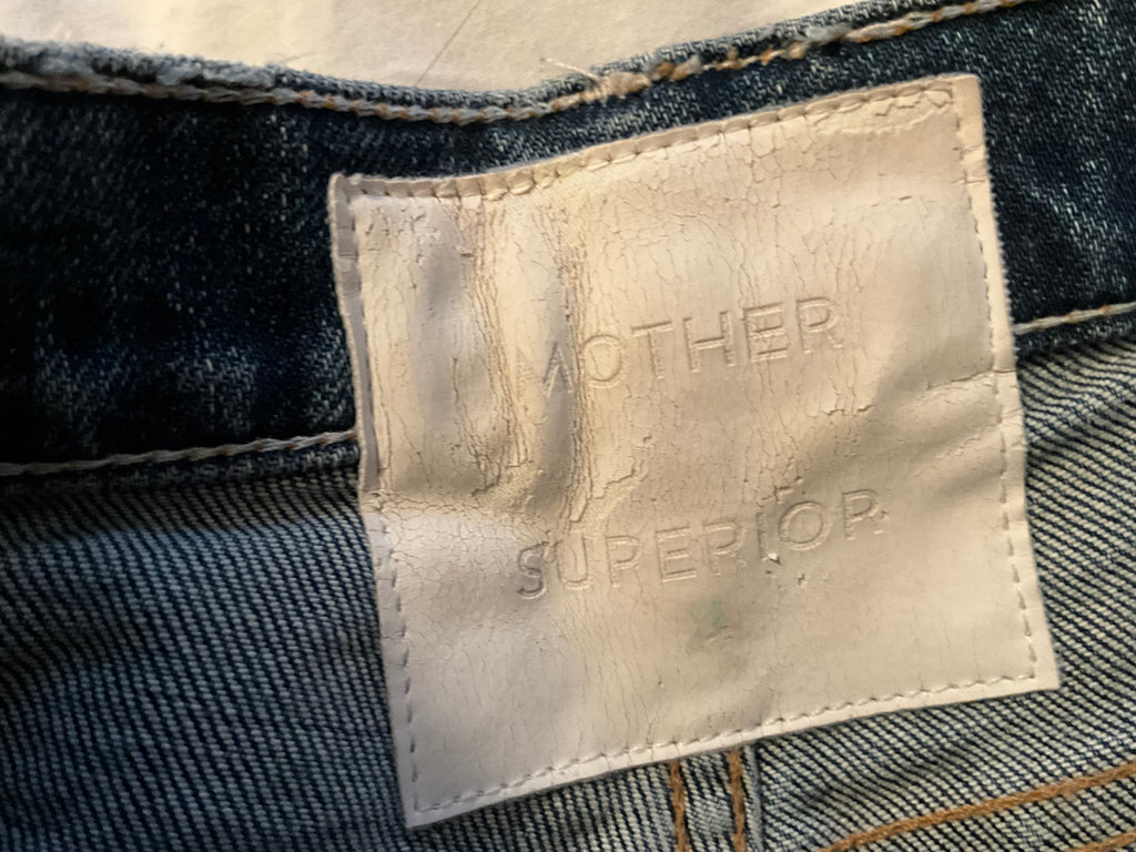 Mother Superior distressed jeans.Button fly. 5-pocket design. Frayed two-tone raw-cut hem. Whiskering and faded detail.