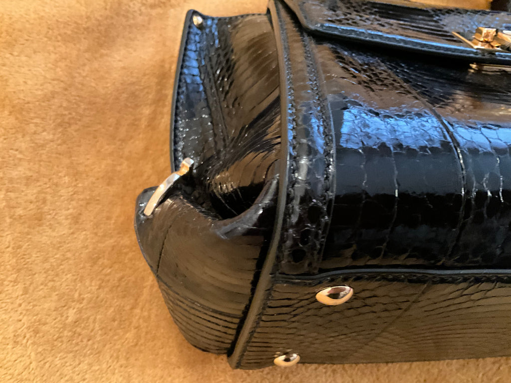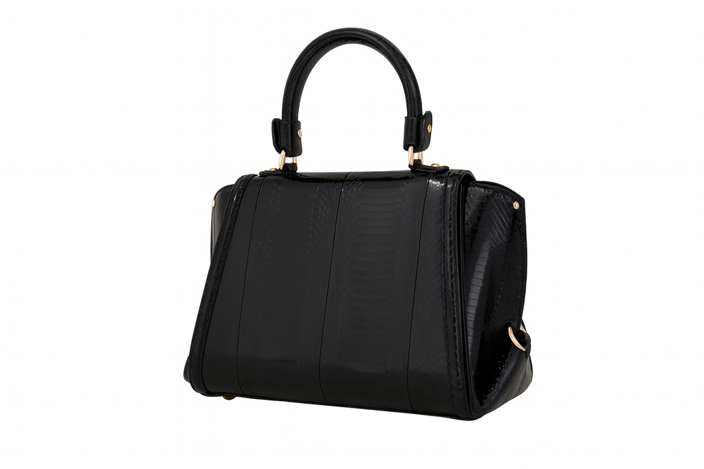 Feminine and elegant small Sofia bag in python with a slightly shiny finish. Classic Gancio closure in metal. Lined in contrasting color leather.