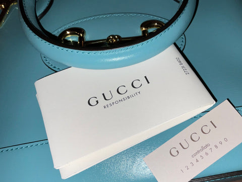 GUCCI Boarded Plutone Calfskin Small Horsebit 1955 Top Handle Bag in Blue This chic handbag is crafted of calfskin in blue. The bag features a horsebit detail at front, rolled leather top handles, an optional adjustable shoulder strap, and polished brass hardware. The top zipper opens to a beige fabric interior with a patch pocket.
