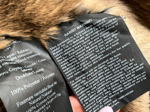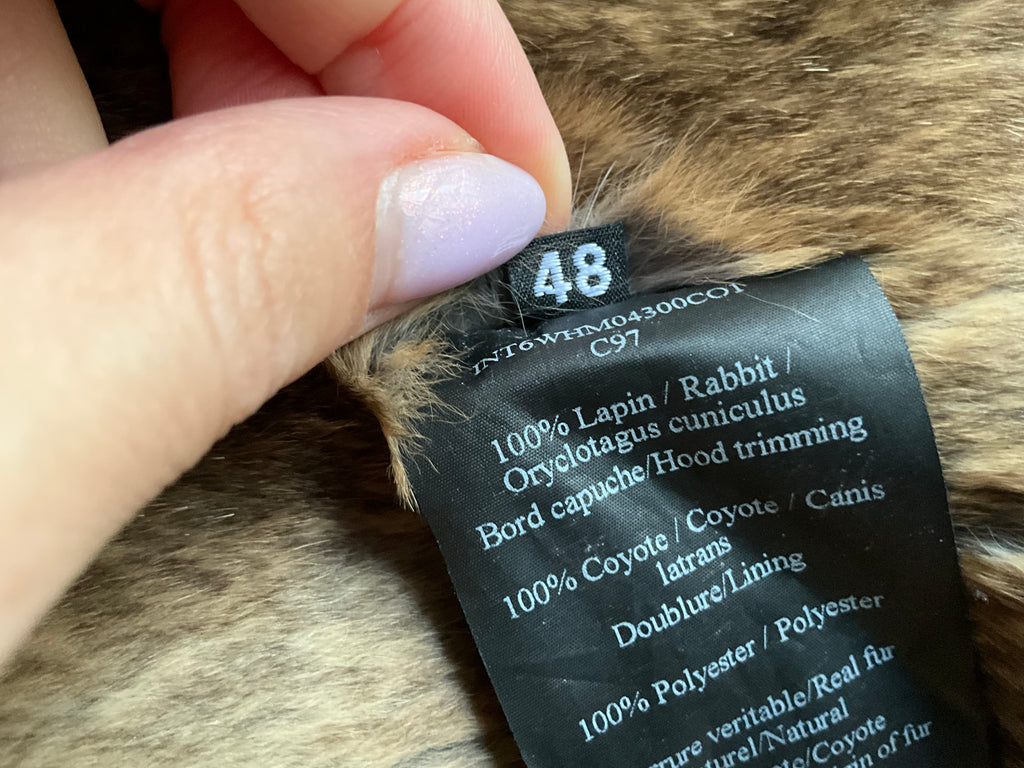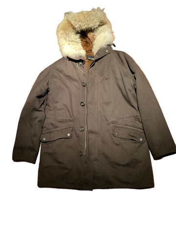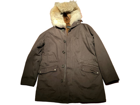 Crafted from a weatherproof cotton blend, it features a removable shaved rabbit fur lining in brown , coyote fur hood trim, and premium down-filled sleeves.