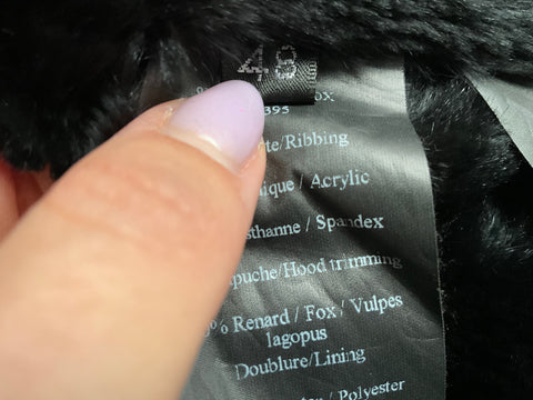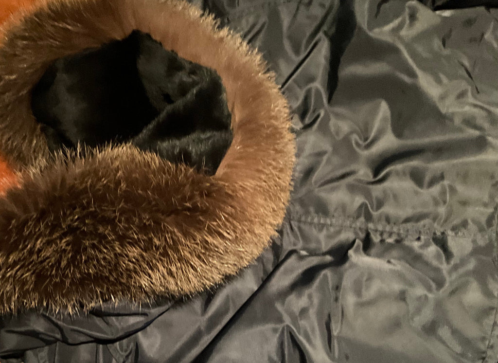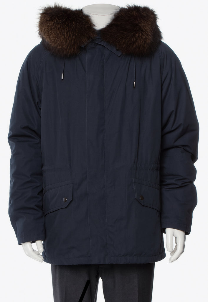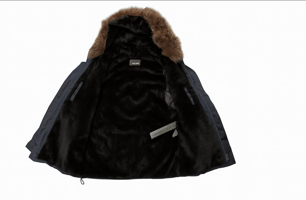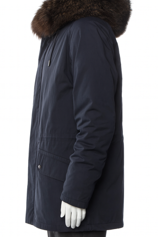 Crafted from a weatherproof cotton blend, it features a removable shaved rabbit fur lining in black, fox fur hood trim, and premium down-filled sleeves.