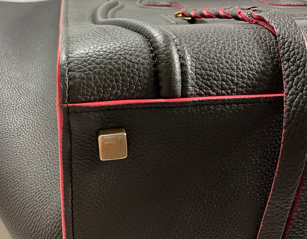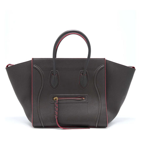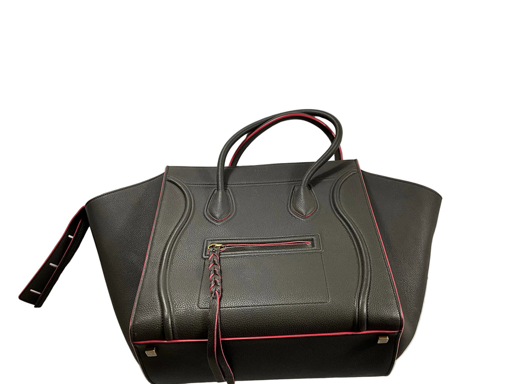 The Celine Phantom Luggage tote is one of the most sought after bags. Featuring a casual yet luxurious style, it is simple and distinctive with its sturdy handles and detailed stitching. This Medium Phantom luggage tote features the distinctive wings and braided zipper pull in classic calfskin leather and chic contrasting trim.