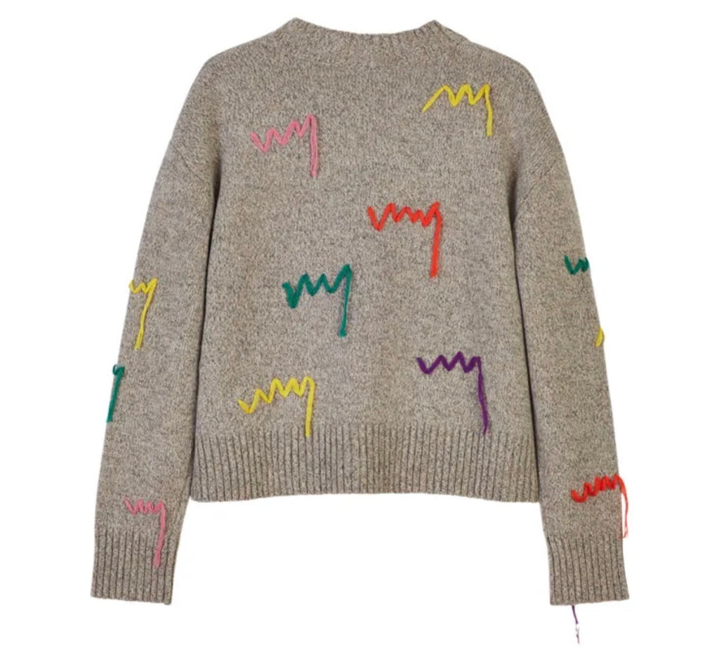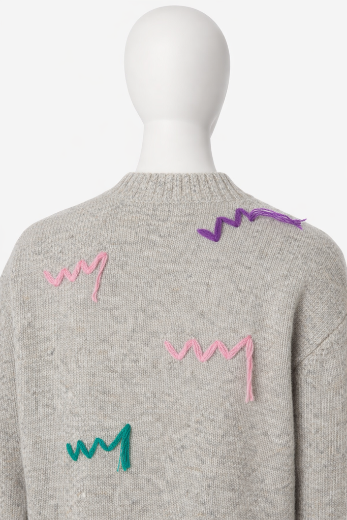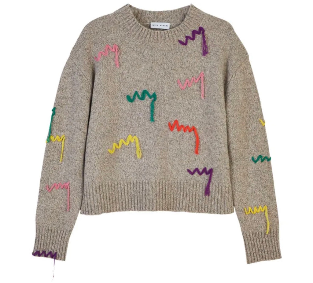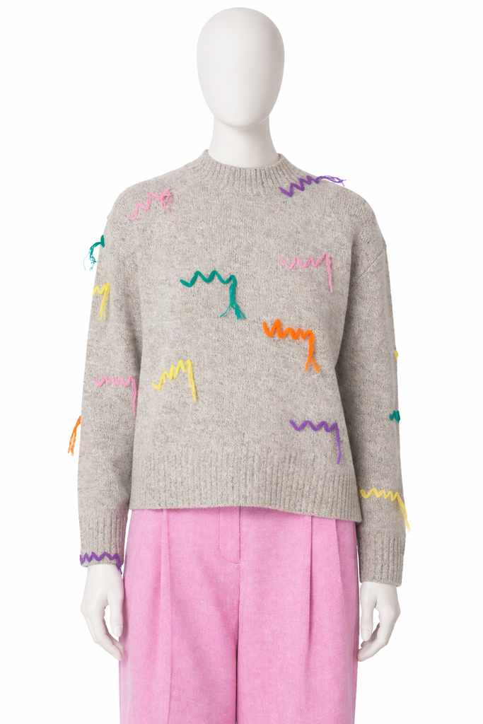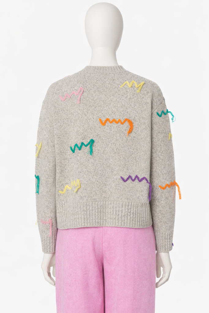 Grey extra fine merino wool knit pullover from Mira Mikati, crew neckline, multicolor embroidery, rib knit , long sleeves.