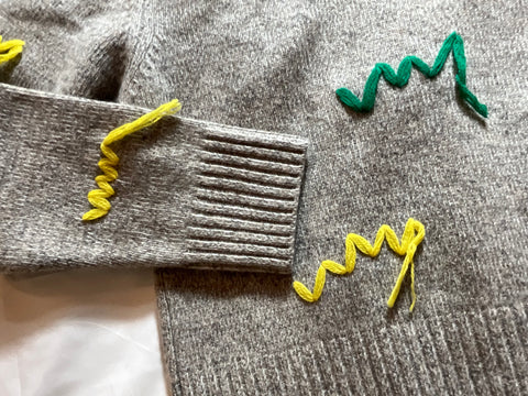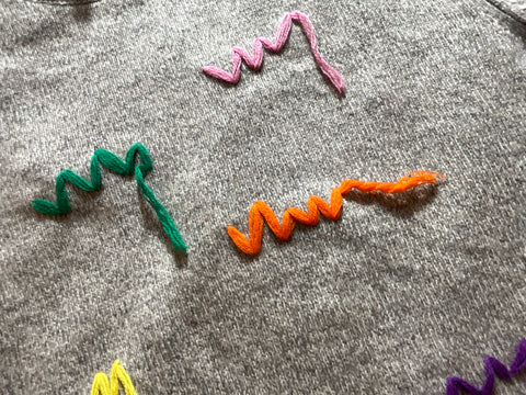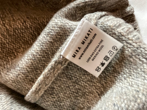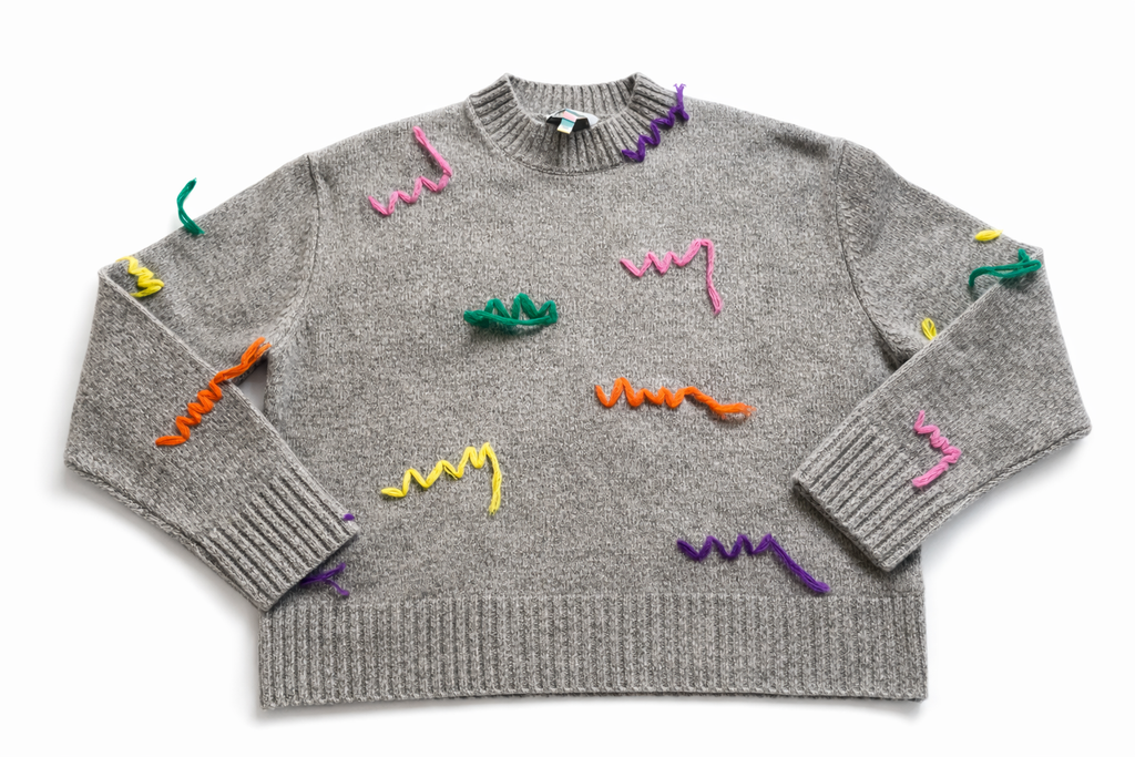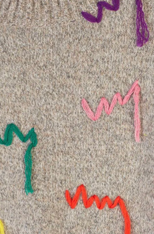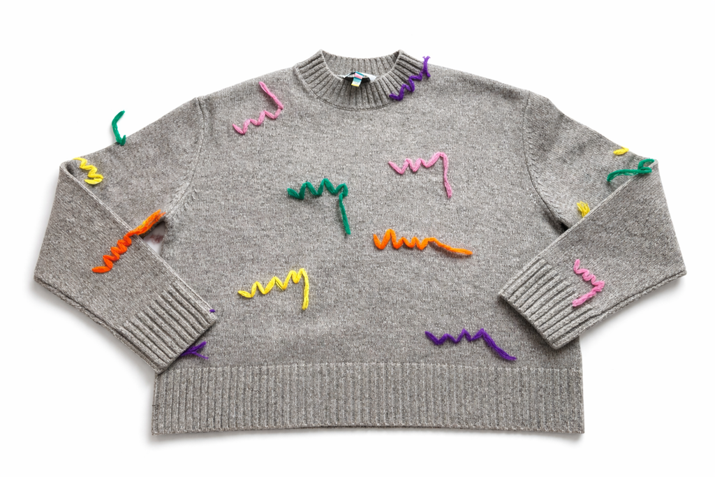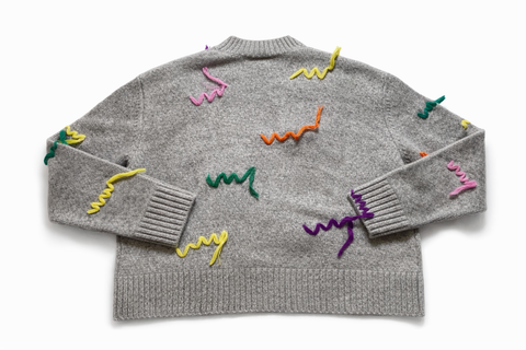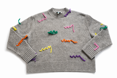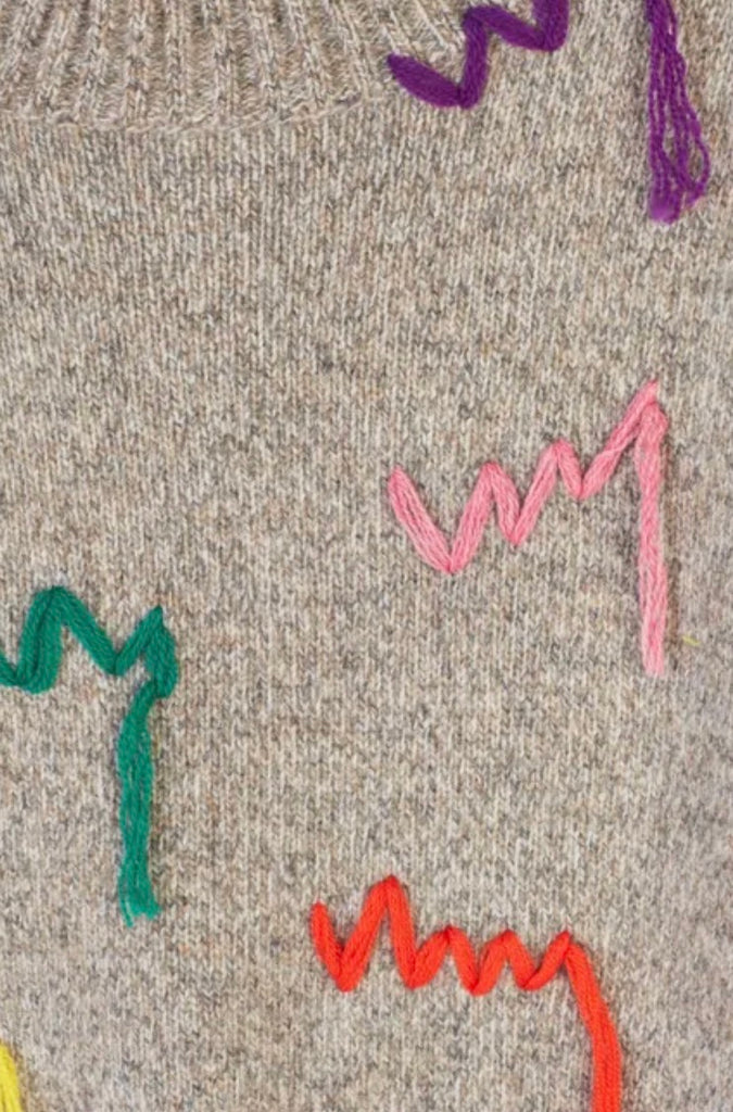 Grey extra fine merino wool knit pullover from Mira Mikati, crew neckline, multicolor embroidery, rib knit , long sleeves.