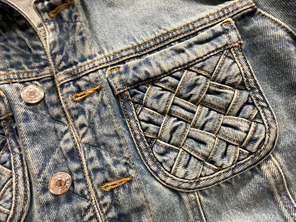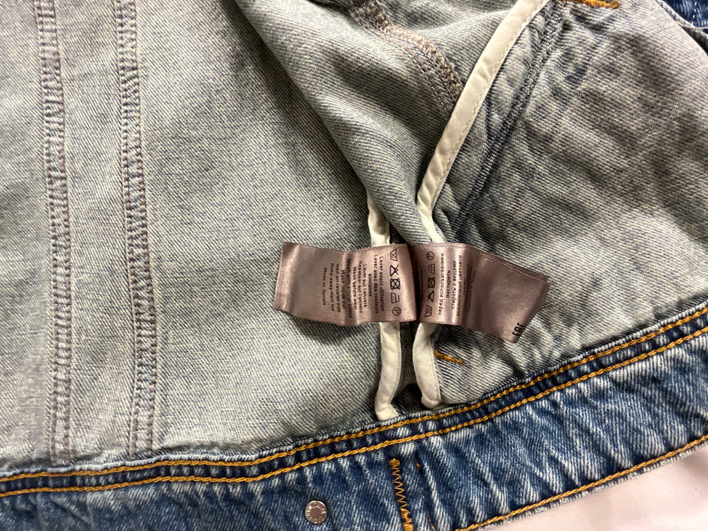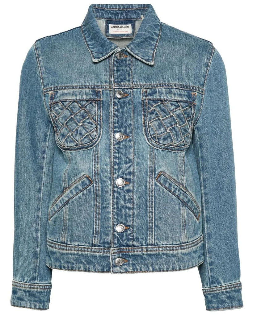 Medium blue jeans Zadig & Voltaire washed denim contrast stitching panelled design spread collar long sleeves with buttoned cuffs two woven-design pockets at chest. side welt pockets waist tabs straight hem unlined front button fastening