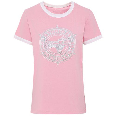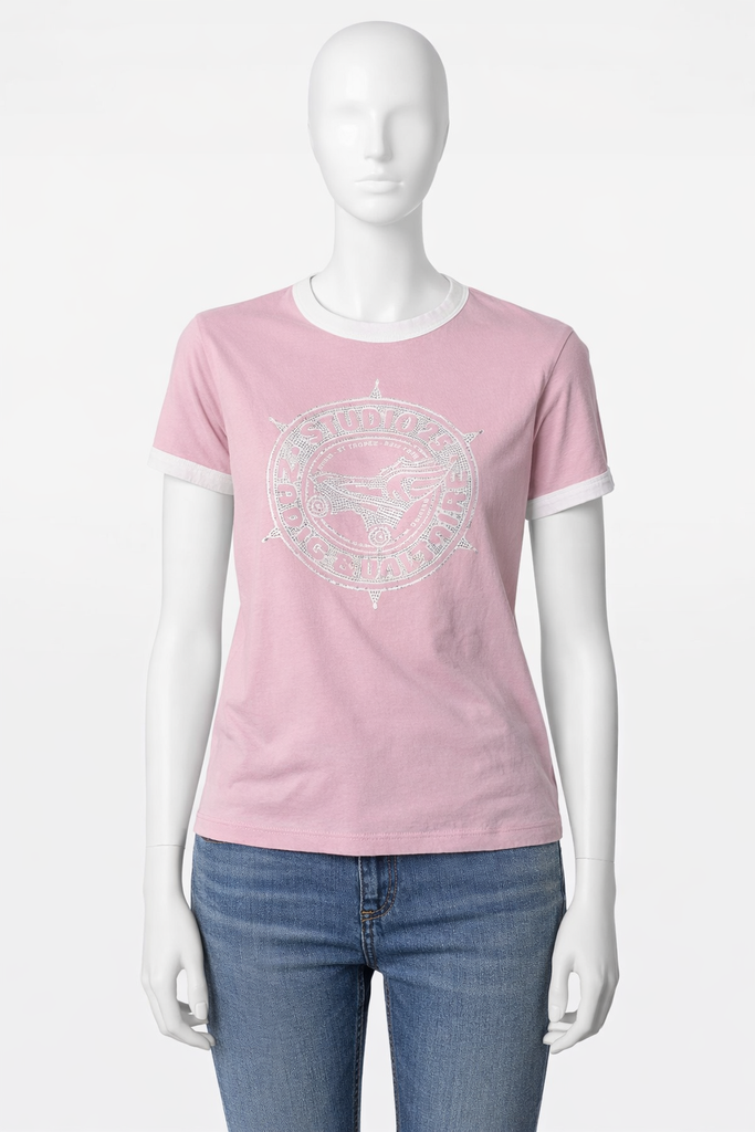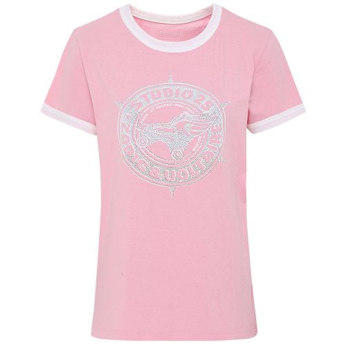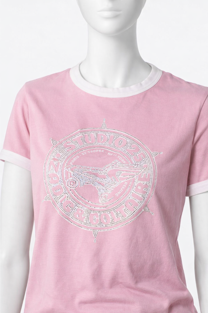 The Zadig & Voltaire Zoe t shirt made in pure cotton jersey, the short sleeve will ensure day-long comfort. Featuring a contrast ringer neck and cuffs, whilst the printed diamante Studio 25 graphic lends statement impact in crystals.