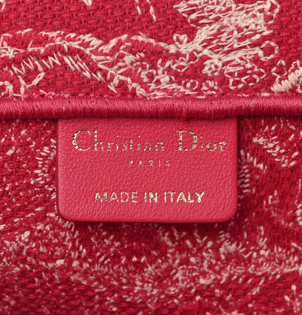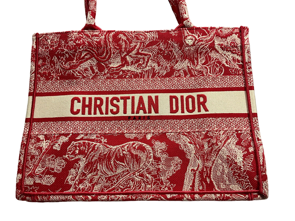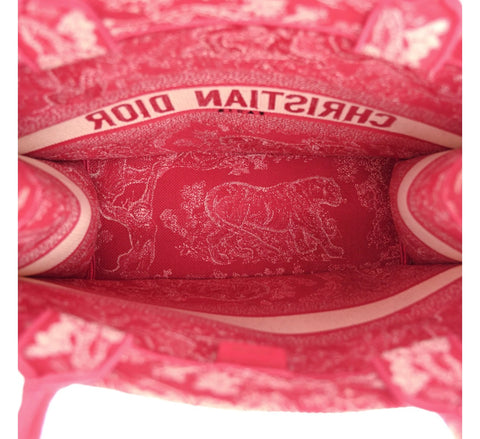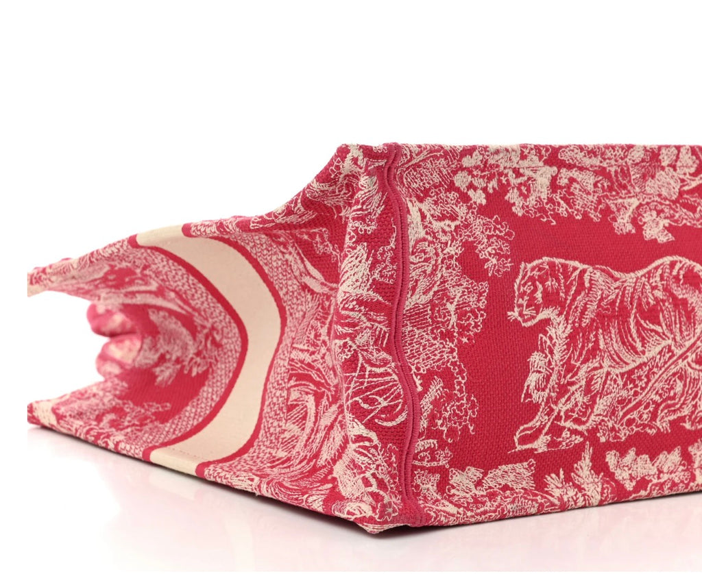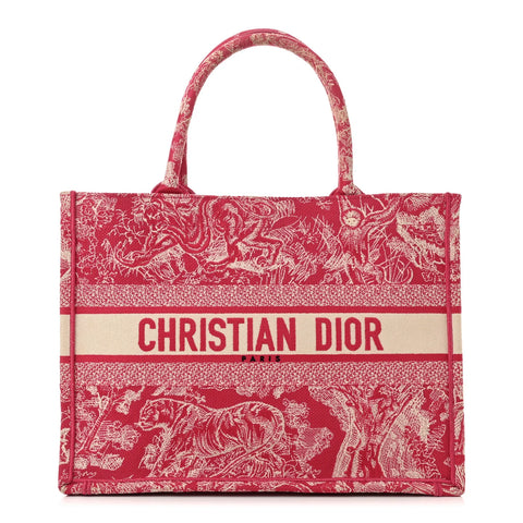 CHRISTIAN DIOR Canvas Embroidered Medium Dioriviera Toile De Jouy Book Tote in Raspberry Pink. This colorful bag is finely crafted of embroidered canvas with a bold jungle graphic in red. The bag features matching canvas rolled handles, with the CHRISTIAN DIOR logo embroidered across the front. The bag opens to a spacious fabric interior.