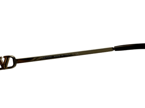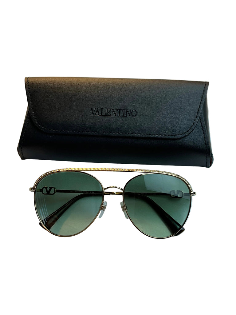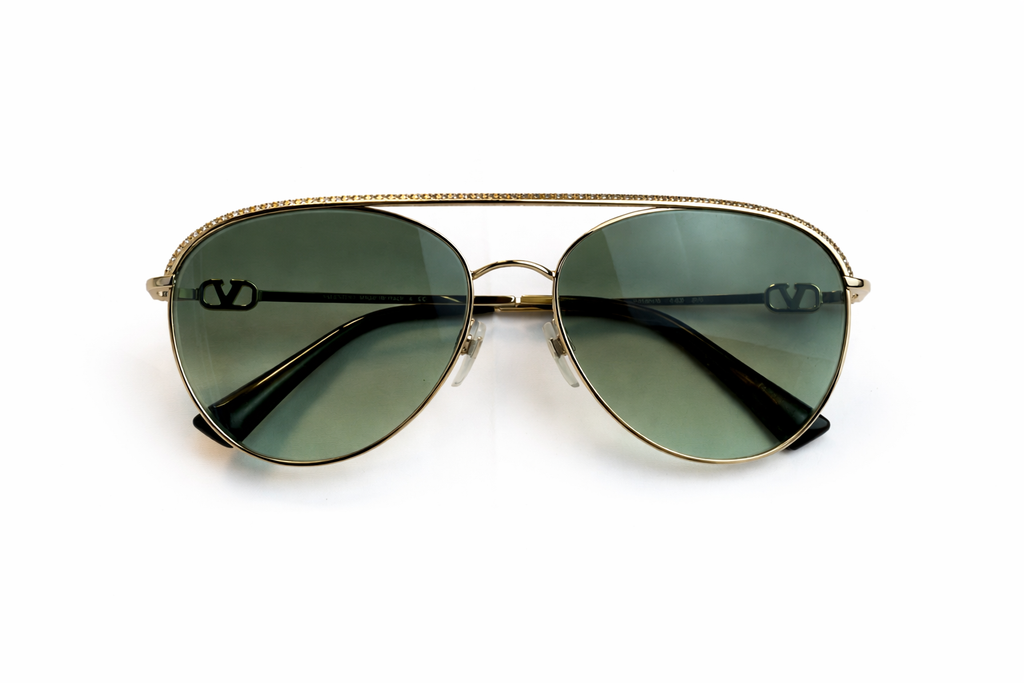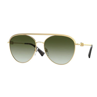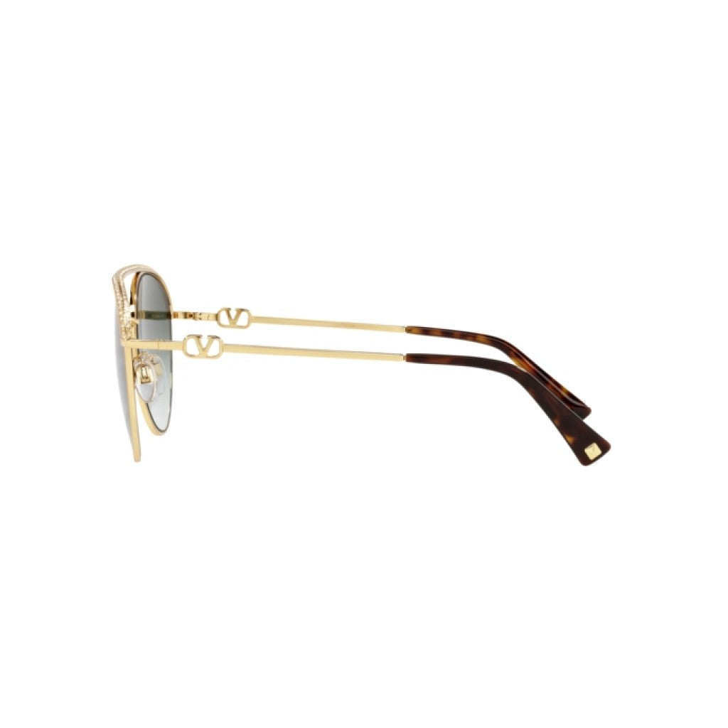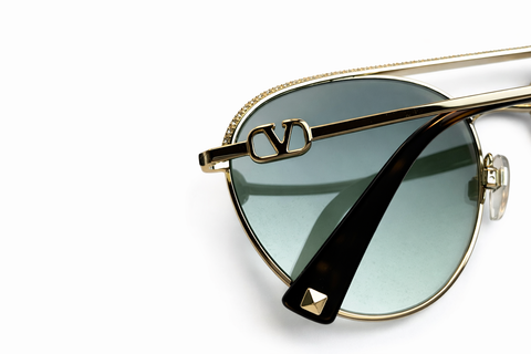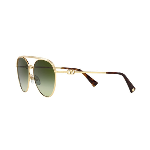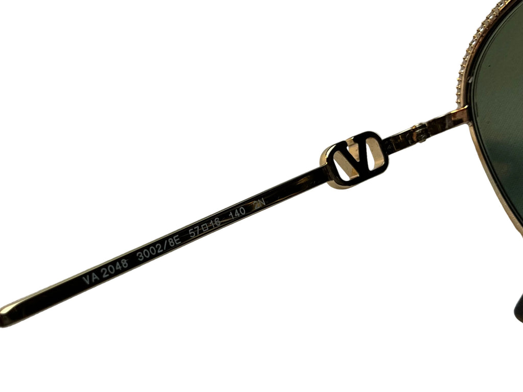Metal Valnetino Sunglasses VA 2048-30028E in Gold and Green. These sunglasses are crafted with a gold-tone metal frame with green lenses. The accessory features the V logo signature motif on the temples.